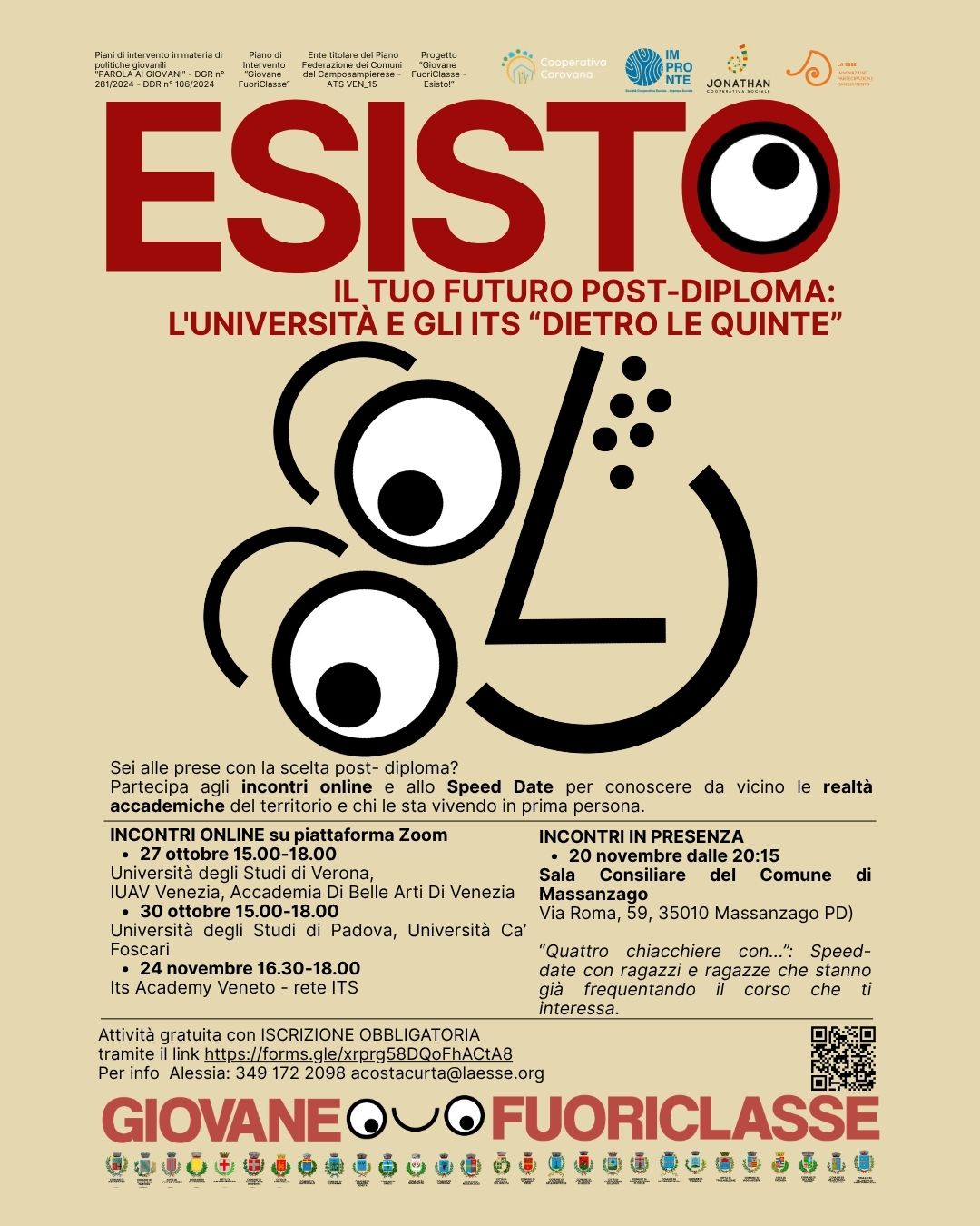 Iniziativa realizzata da La Esse scs all'interno del Progetto “Giovane FuoriClasse - Esisto!” prevista all'interno del Piano di Intervento in materia di Politiche Giovanili “PAROLA AI GIOVANI” della Regione del Veneto DGR n° 281/2024 - DDR n° 106/2024. , di cui come da adesione dall’Ambito Territoriale Sociale VEN_15, composto dai 28 Comuni dell’Alta Padovana.
